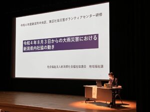 第二部では、新潟県社会福祉協議会地域福祉課課長代理 河野弘輝氏より、新潟県北部豪雨災害における県内社会福祉協議会の動きを